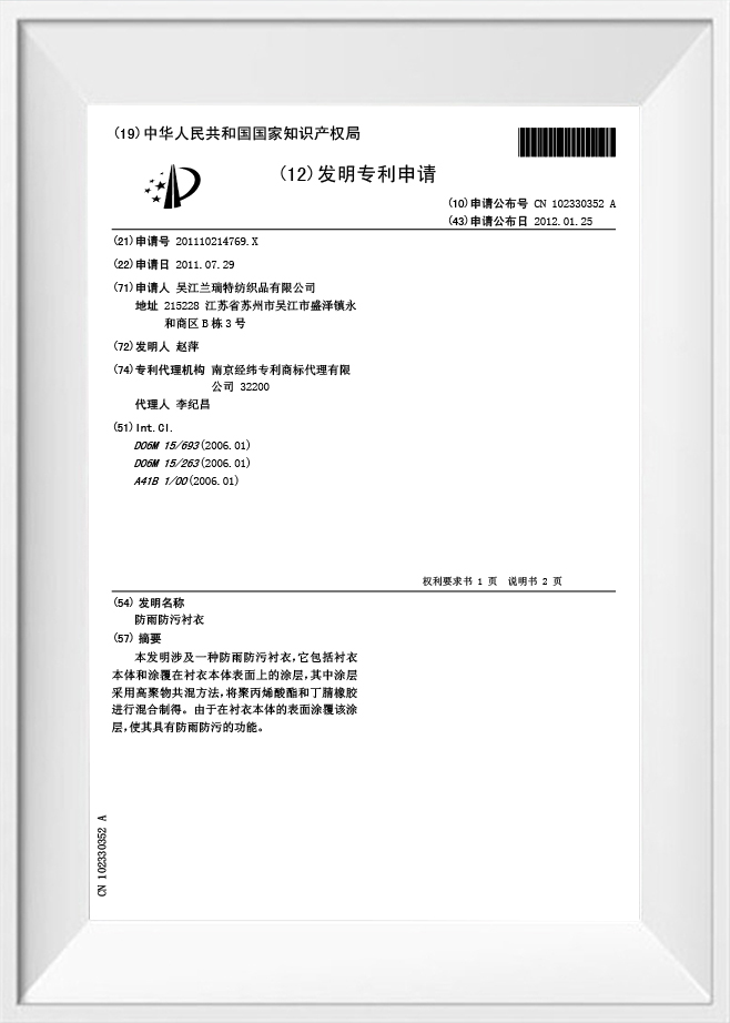 Patent vynálezu na voděodolnou košili proti rozstřiku